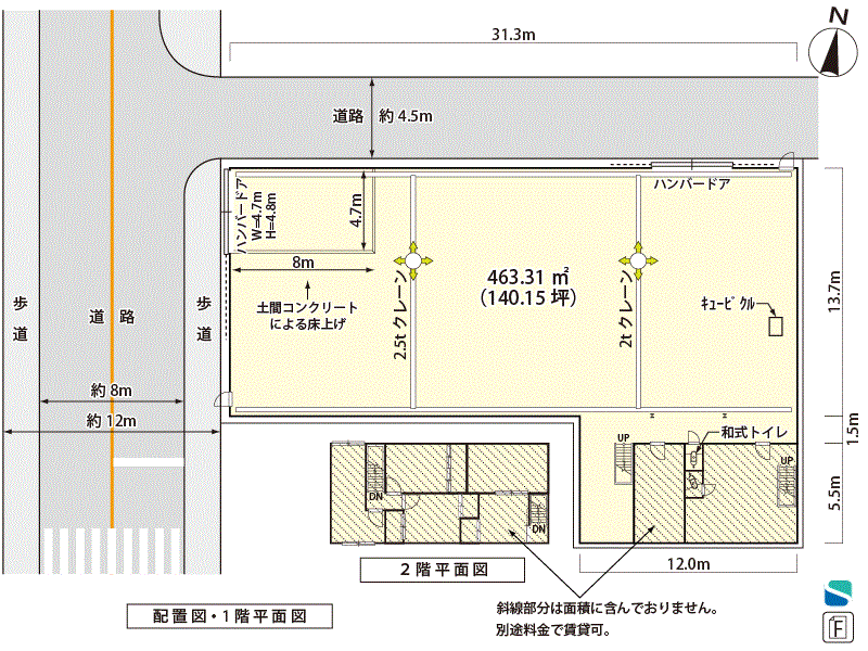 *家賃保証会社加入要(初回100%、更新10%/年) *2年以内の解約は短期解約違約金1ヶ月あり *修繕負担について、主要構造部と入口ハンガードアの経年劣化は貸主負担。それ以外は借主にて維持管理。天井クレーン、キュービクルも性能保証無し *工場部分の面積は13.7m×31.3m=428.81㎡(約129坪)公簿面積 *入口に幅4.7m×奥行8mのトラック入庫スペースあり、それより先は土間コンで約30cm~上がっています *図面斜線部分は面積に含んでおりませんが別料金で賃貸可。使用しない場合は封鎖 |
